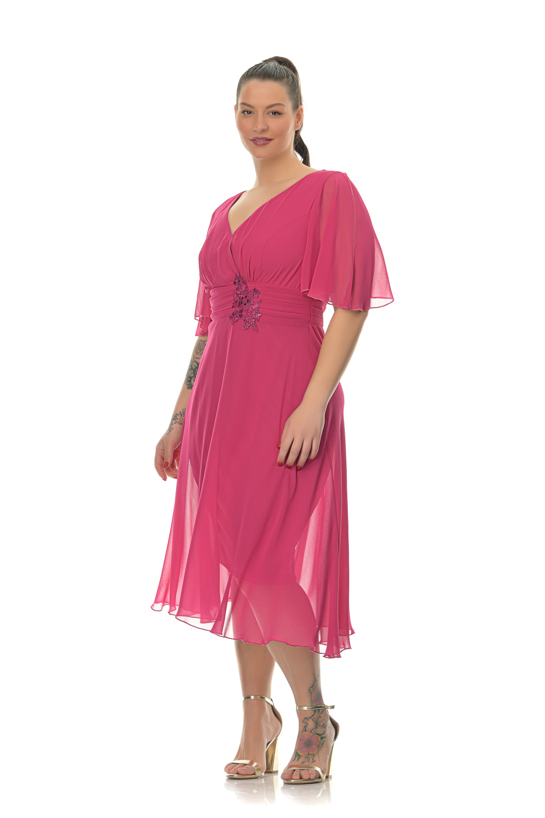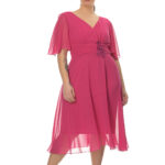 S56868_08 Φόρεμα μίντι,φούξια, κρουαζέ, με κέντημα στη μέση.