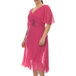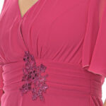 Φόρεμα μίντι,φούξια, κρουαζέ, με κέντημα στη μέση, γραμμή άλφα. Ύφασμα μουσελίνα.